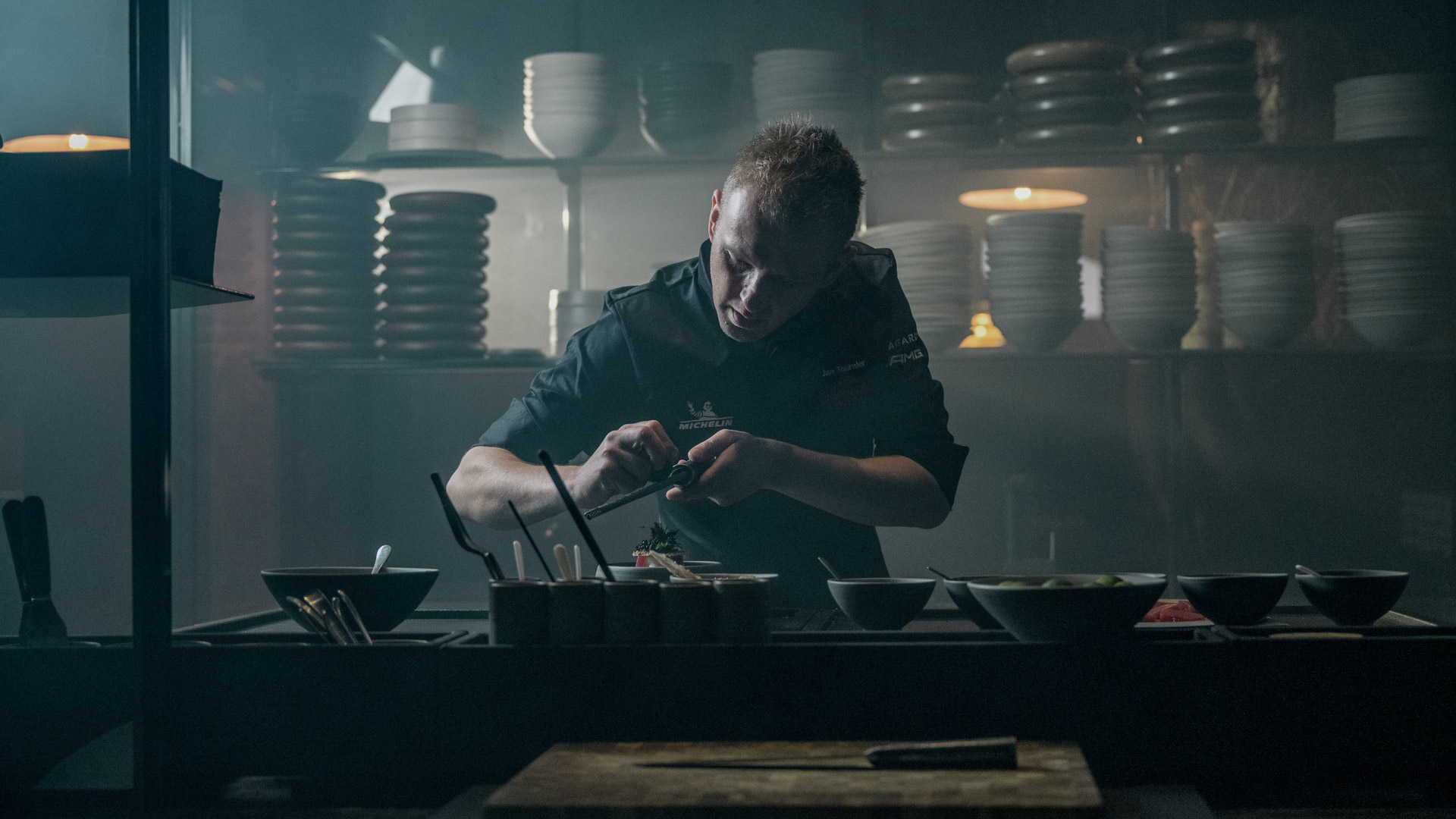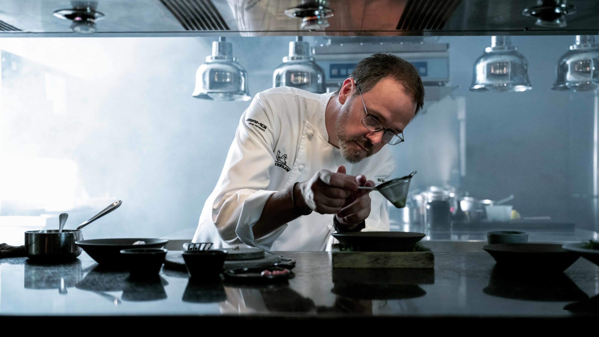 First-class MICHELIN chefs are portrayed in interplay with the aesthetic and powerful car design of Mercedes-AMG.